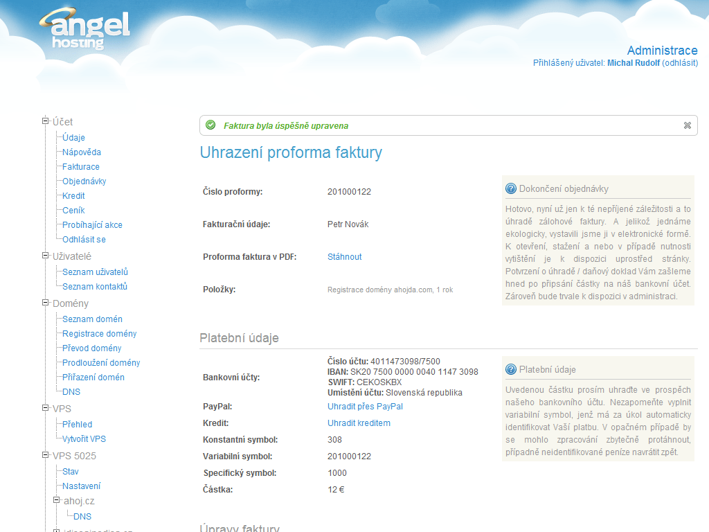 uhrazení faktury a zahájení zpracování objednávky lze fakturu uhradit kreditem nebo přes platební bránu PayPal (vč. možnosti platby kreditní kartou).