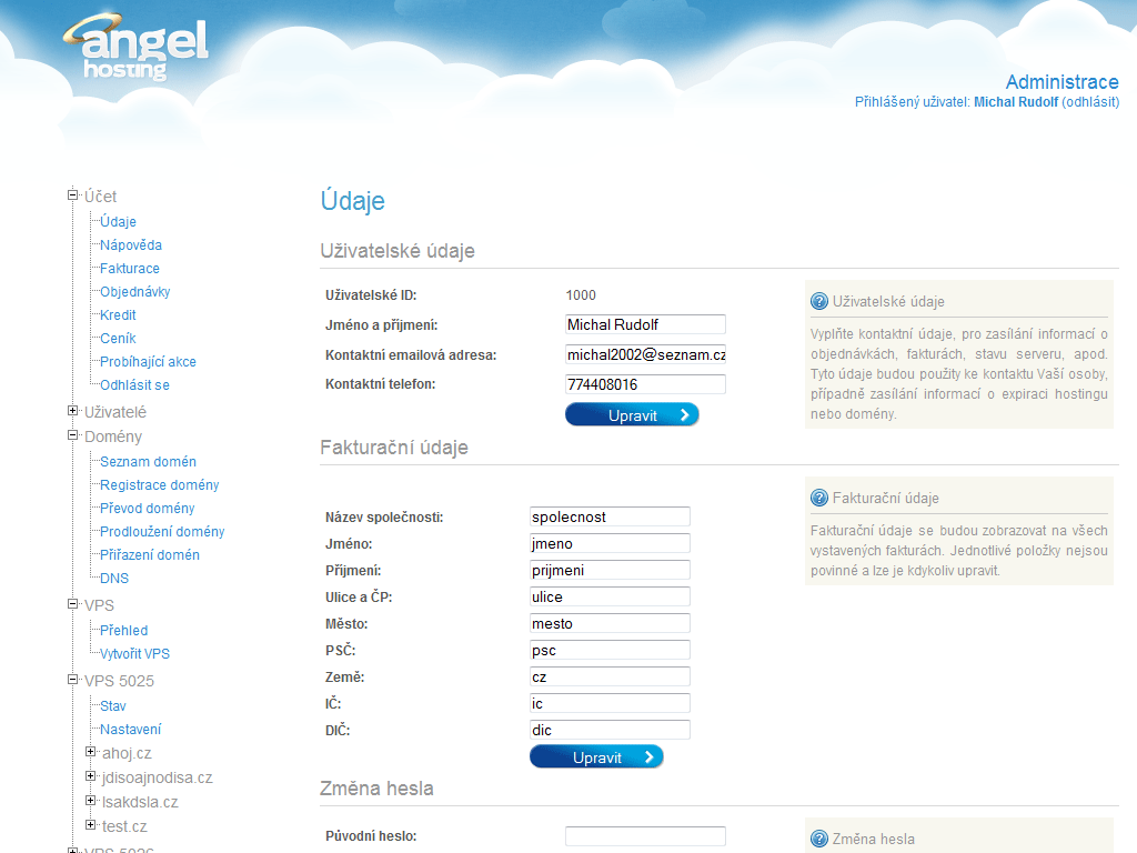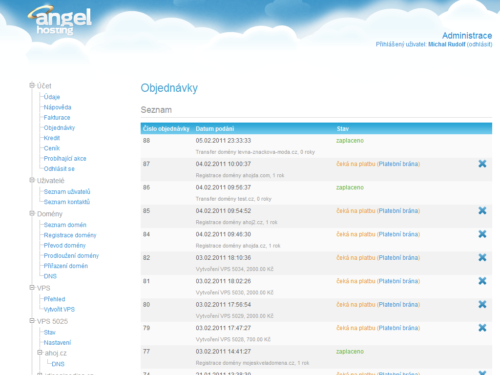 Všichni naši zákazníci získají přihlašovací údaje do námi vyvinuté administrace, kde mohou upravovat nastavení všech objednaných služeb. Možnosti administrace jsou velmi rozsáhlé od správy VPS po registraci domén a objednávání certifikátů. Na této stránce si můžete prohlédnout náhledy některých vybraných sekcí s jejich popisem.