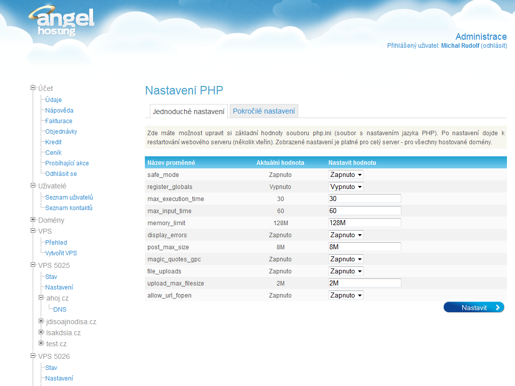 Vašim projektům. Nastavení php.ini je možné z administrace upravit i pro jednotlivé domény, které na serveru hostujete.