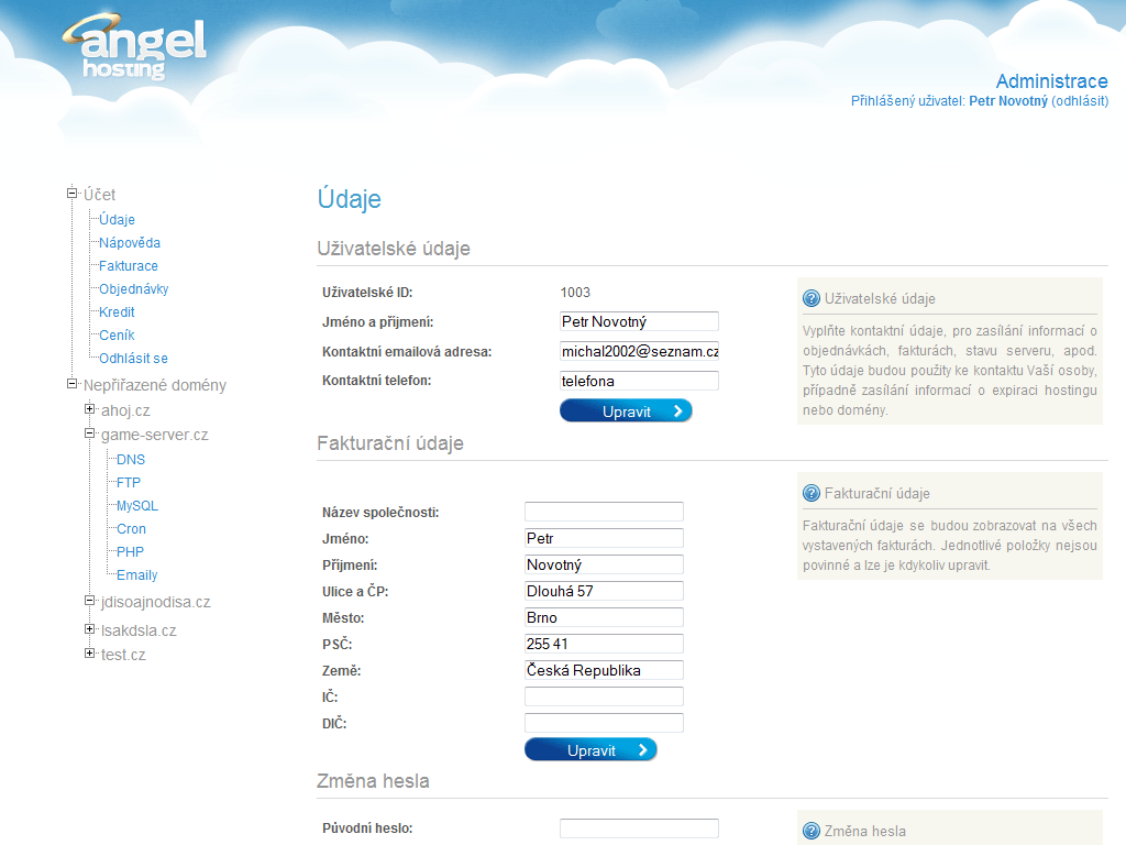 Pokud máte ke svým doménám správce nebo zákazníky, stačí pro ně vytvořit uživatelský účet s příslušným oprávněním - správce tak může zasahovat pouze do domén,